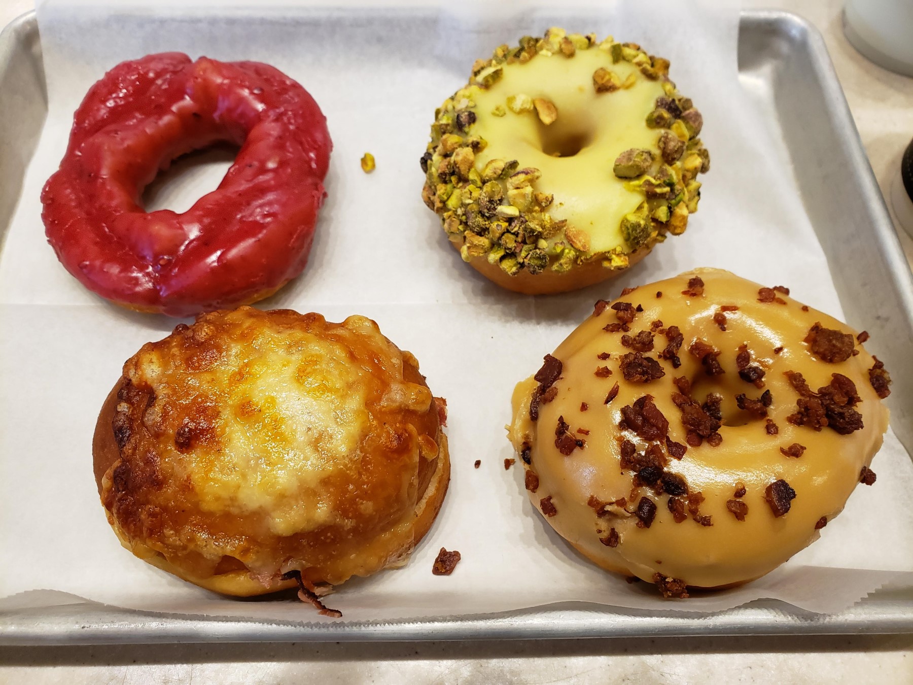 Our selections from Revolution Doughnuts, clockwise from top left: Blackberry Caramel, Orange Pistachio, Caramel Bacon Crumble, and the Crunchy Mister, a savory creation with ham, cheese and bechamel.
