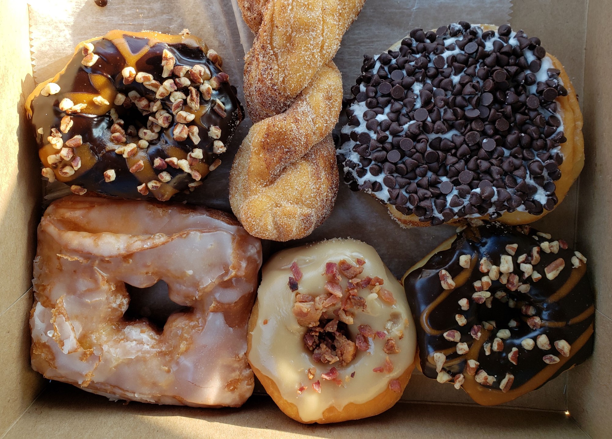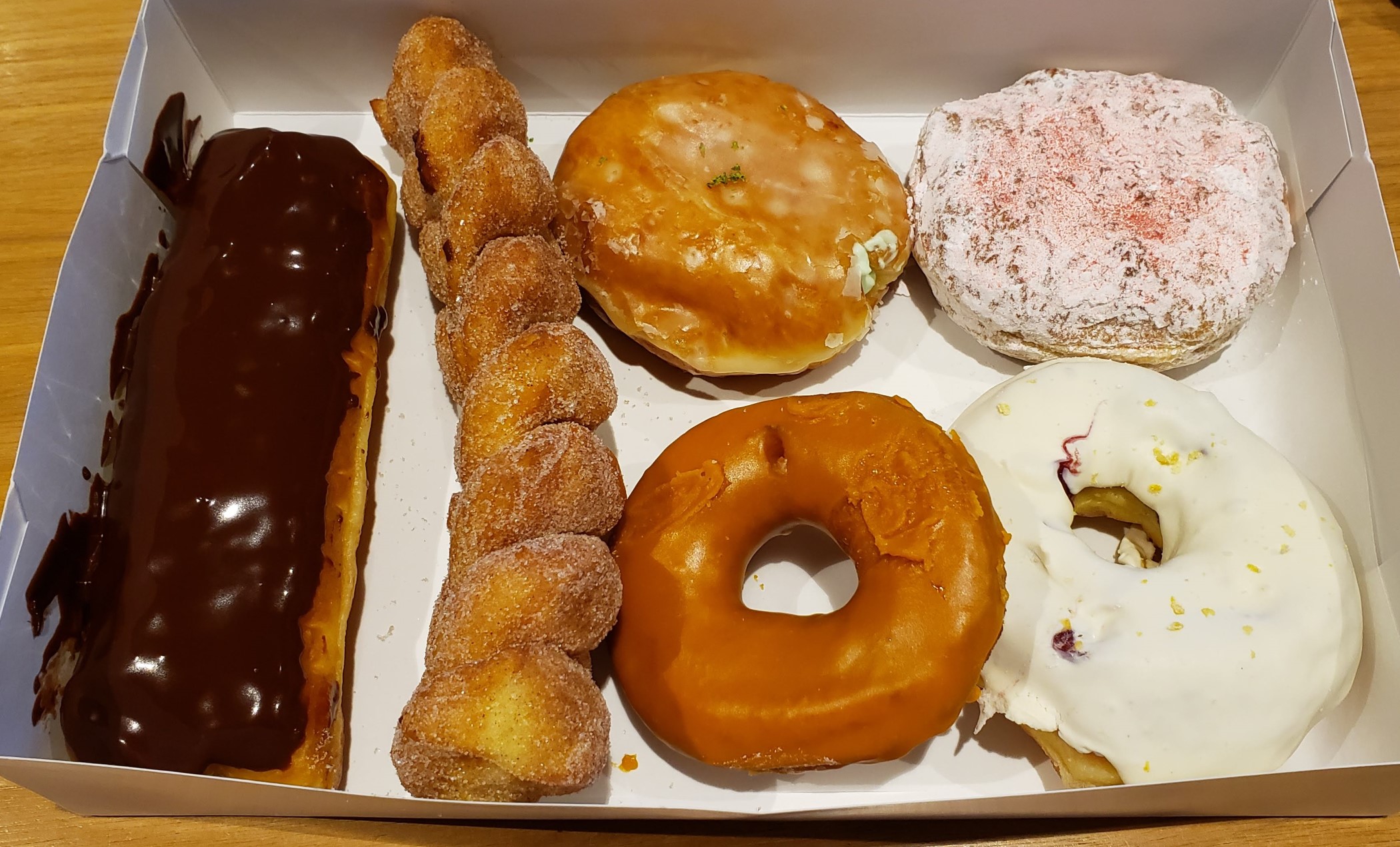 Our last breakfast, as it were: chocolate long john, cinnamon braid, key lime pie, white chocolate raspberry, strawberry shortcake, and Butterbeer (vanilla and cream soda cake donut with butterscotch icing).