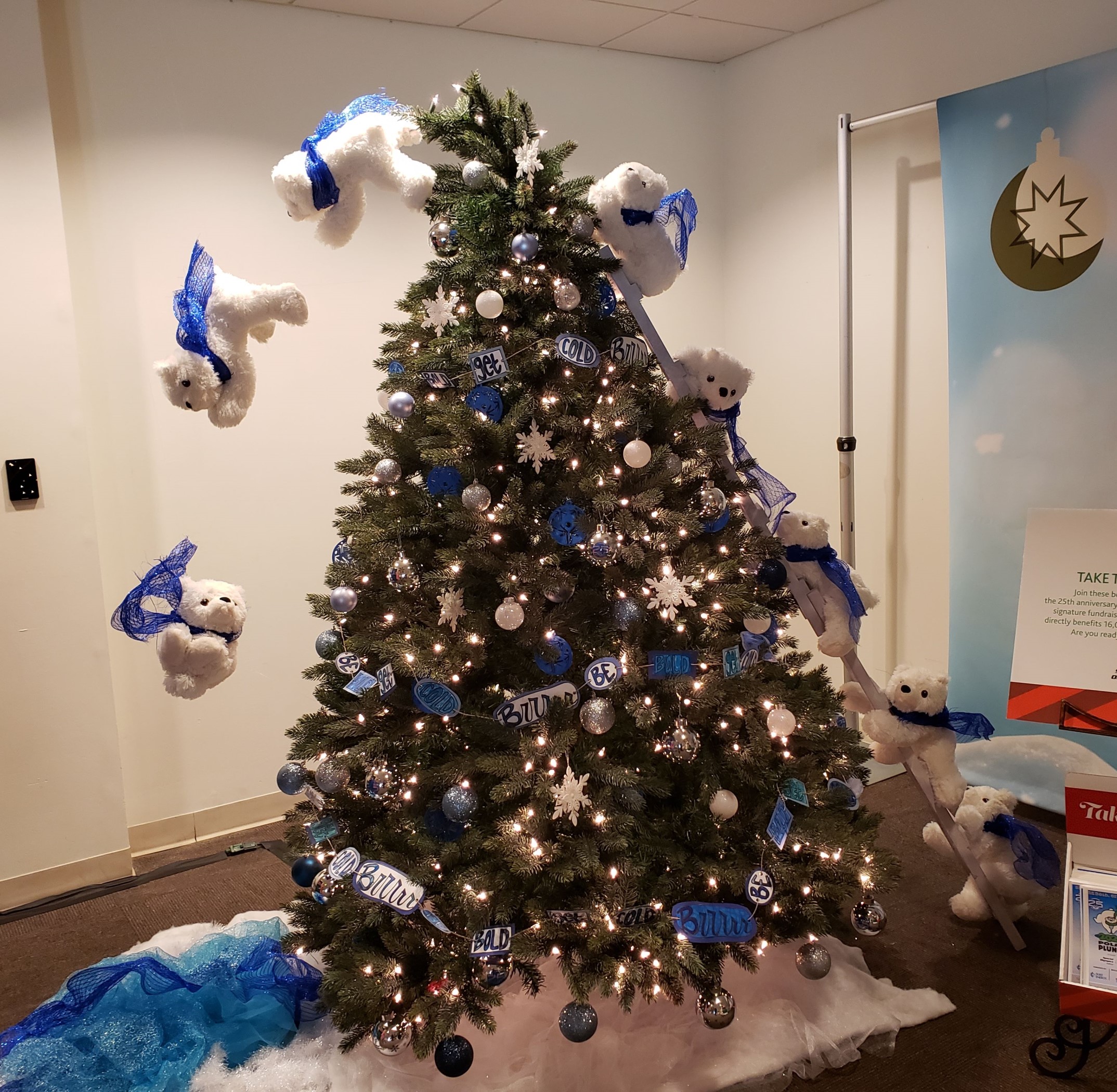Christmas tree with stuffed polar bears climbing up one side on a tiny ladder, then suspended on wires to look as if they're taking turns diving off the other side into a "pool" made of blue ribbon.