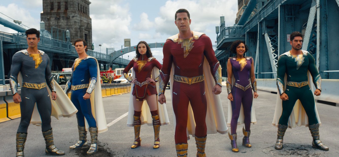 Scene from the second Shazam movie with all six powered-up Shazam Family members standing on a bridge, looking at you.