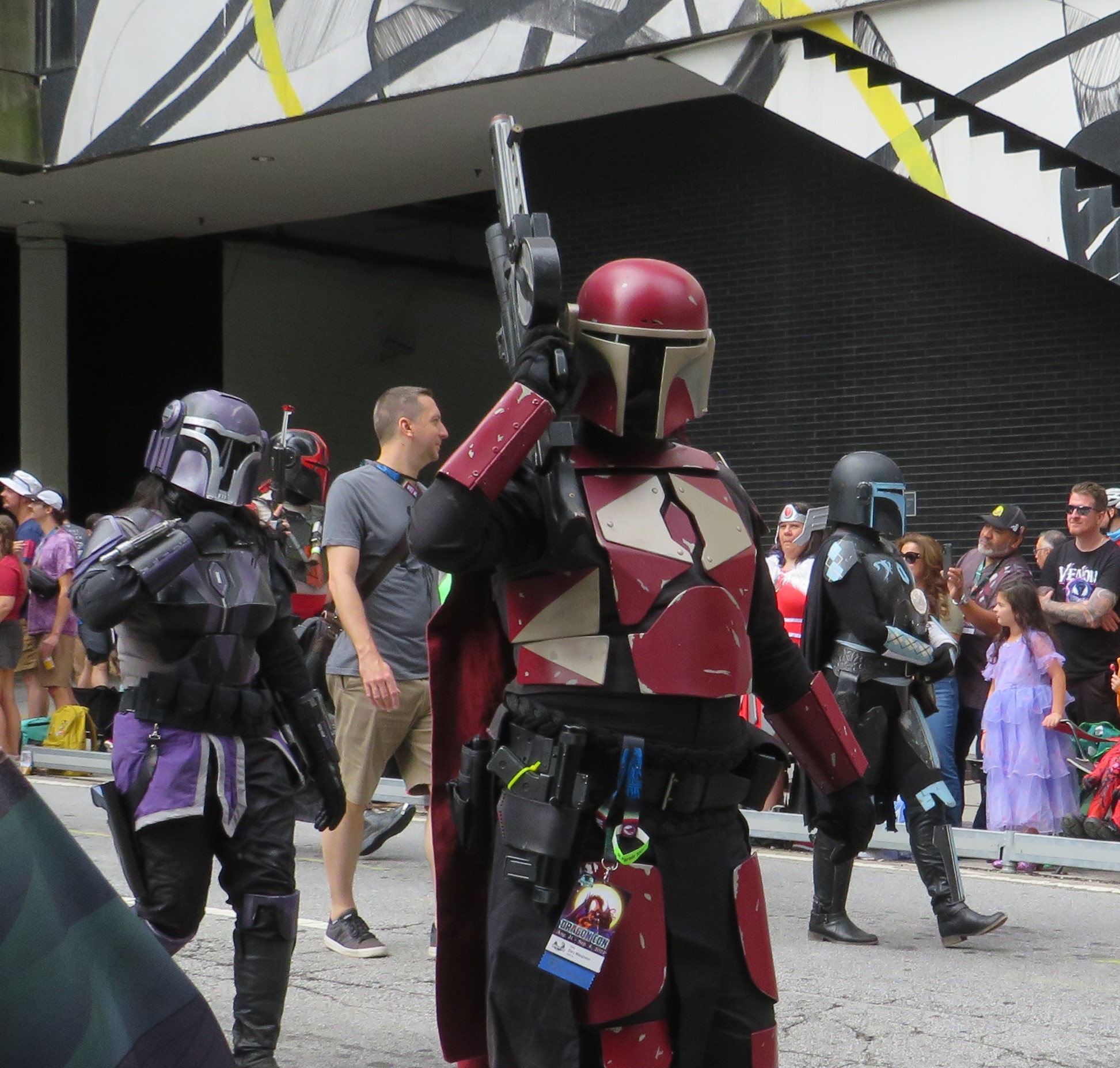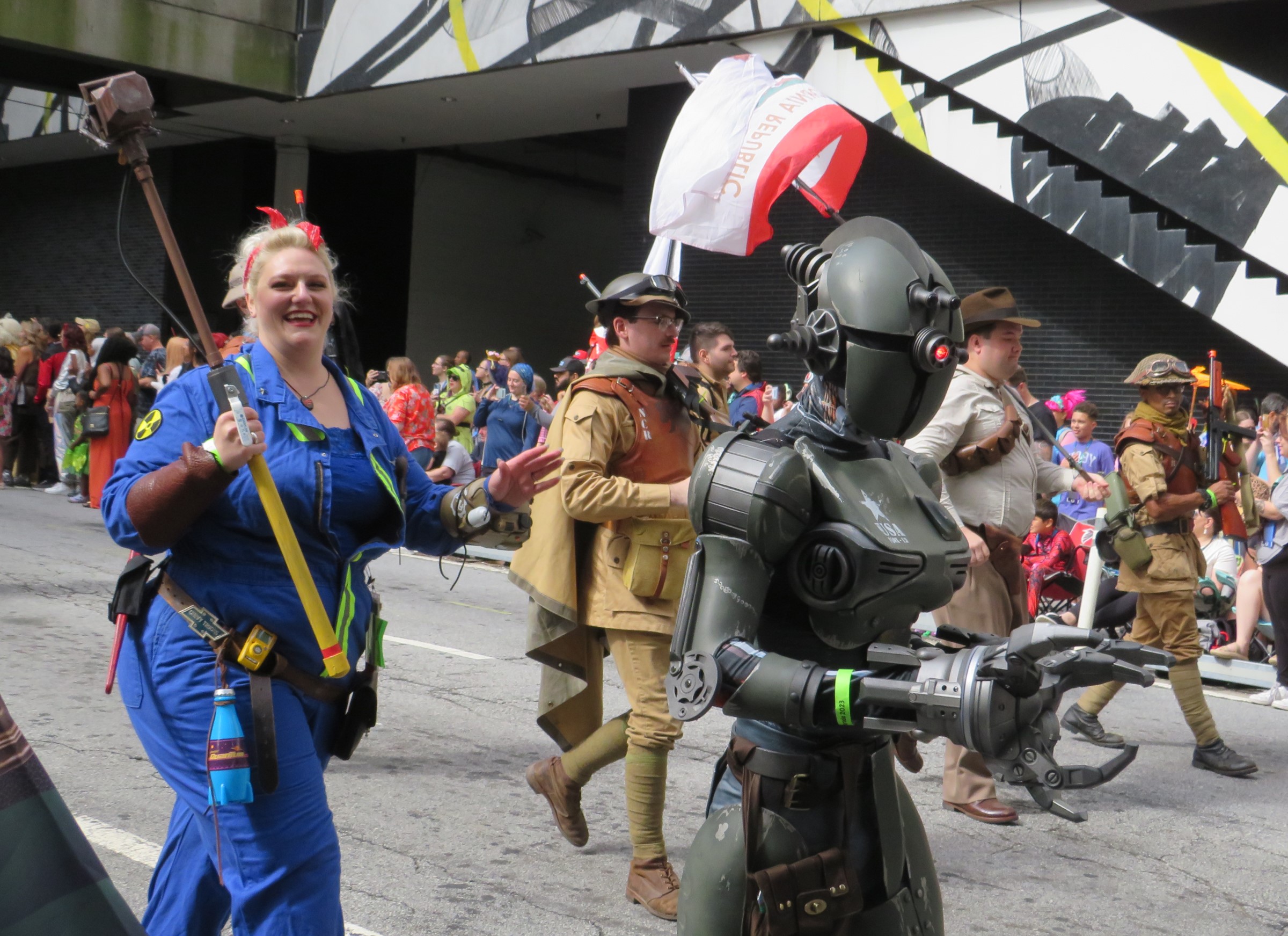 …but in the meantime: more cosplay pics! Except where noted, the following pics were taken Saturday between 11:30 a.m. (when the final marchers in the annual cosplay parade reached the end of the route) and 7:00 p.m., when we dragged ourselves down the Marriott’s fire-exit stairs to circumvent the out-of-order escalator and take our leave of the festivities. Same as last time, we snapped a fraction of a fraction of a fraction of a fraction of the total talents on display, as mere amateur appreciators who like sharing such sights and wonders to You, The Viewers At Home. Sorry we missed thousands more! We just kept doing other stuff! And we’re too old to keep up this pace for 72 straight hours!