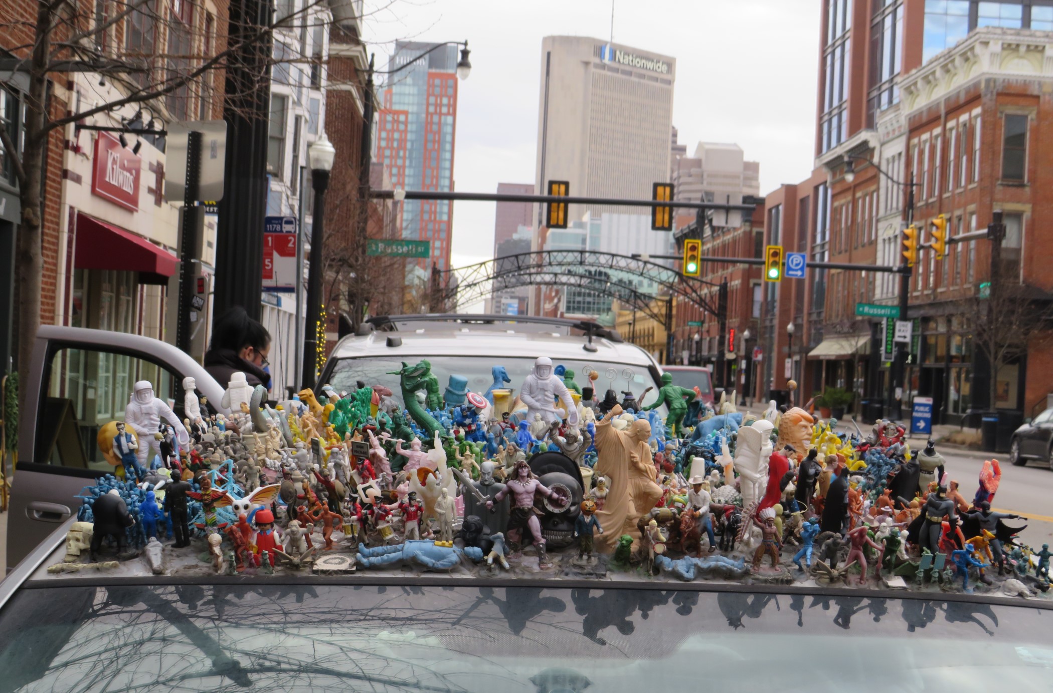 A bunch of toys glued to a car roof; downtown Columbus is hazy in the distant background.