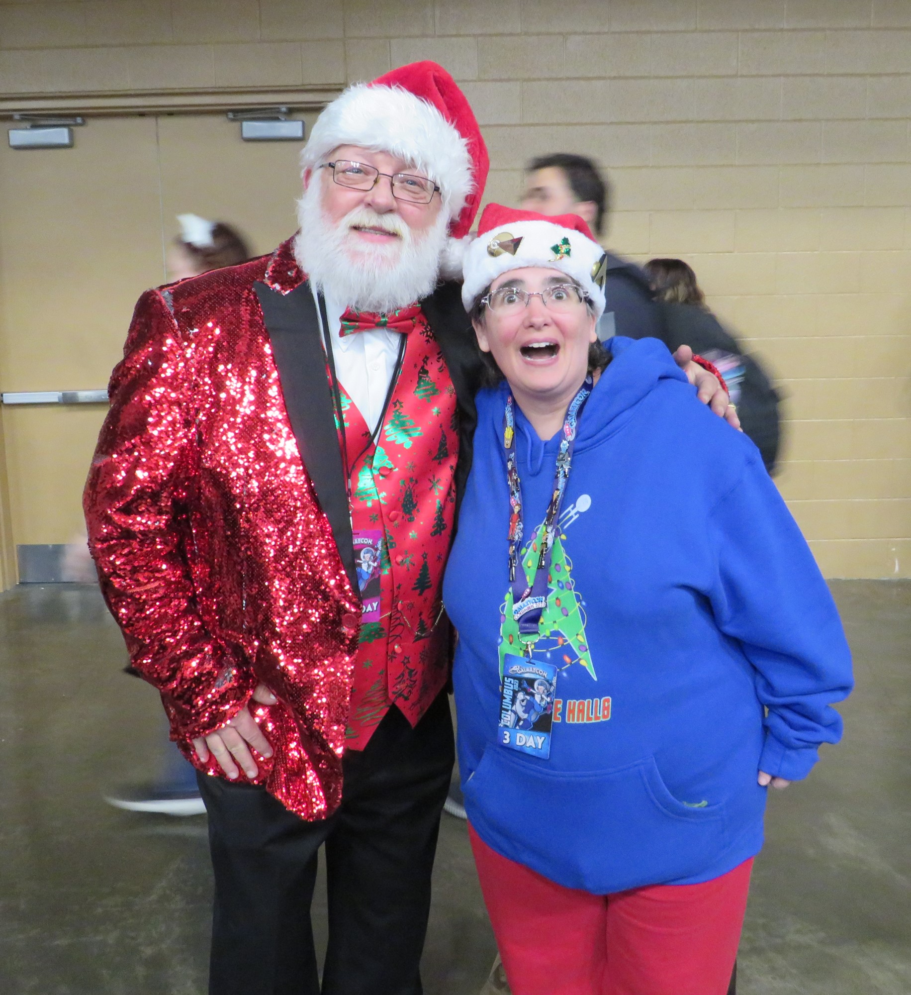 My wife wearing a Santa hat and blue hoodie with a Starfleet insignia (drawn with Christmas lights wrapped around it) and the slogan "Trek the Halls". She happily hugs an elderly jolly man in Santa hat, beard, red vest with green Christmas trees on it, and a Vegas lounge jacket covered in red sequins.