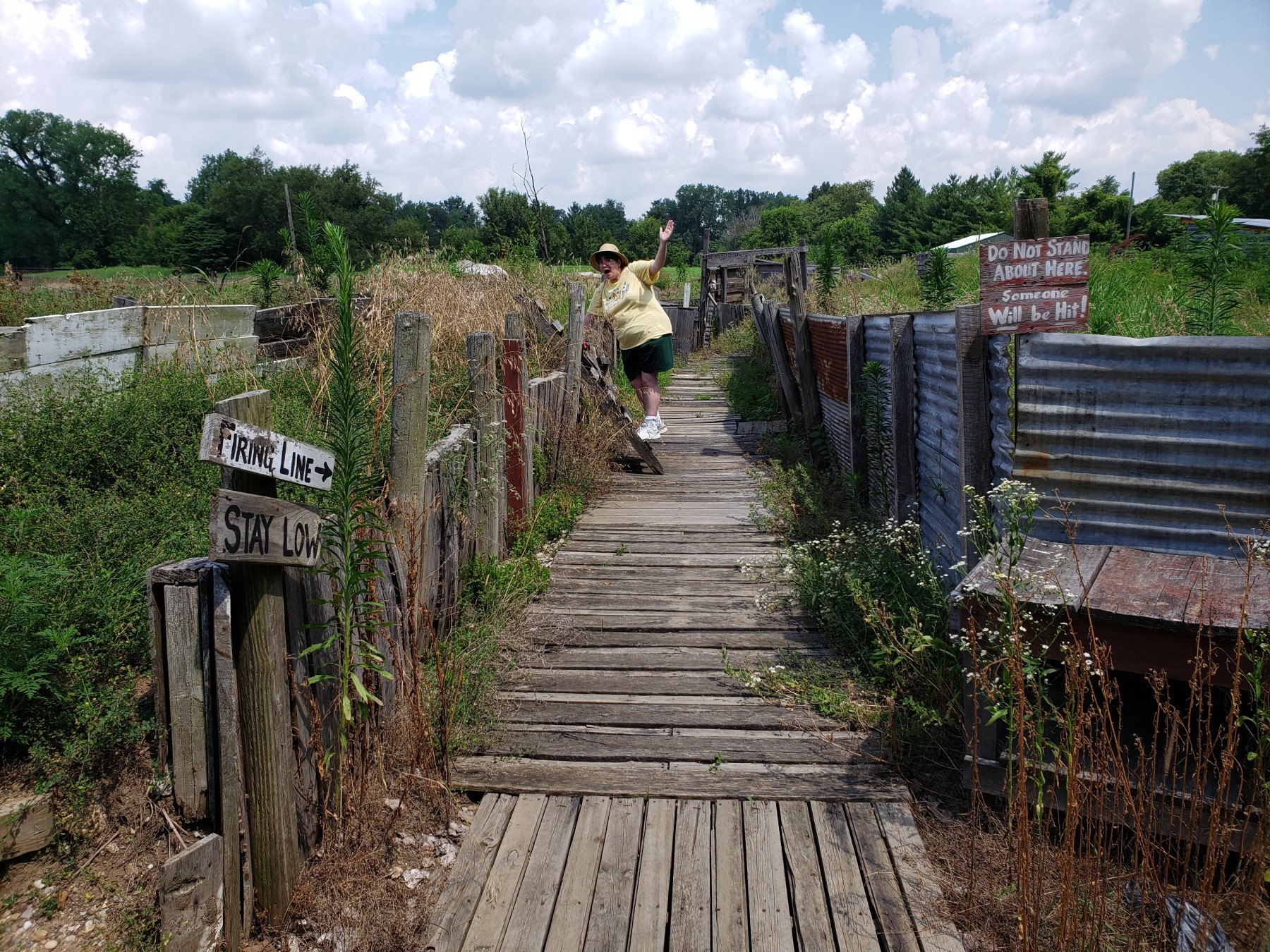 DAY THREE: Anne finding her own path of glory in the simulated WWI trench behind the Indiana Military Museum in Vincennes.