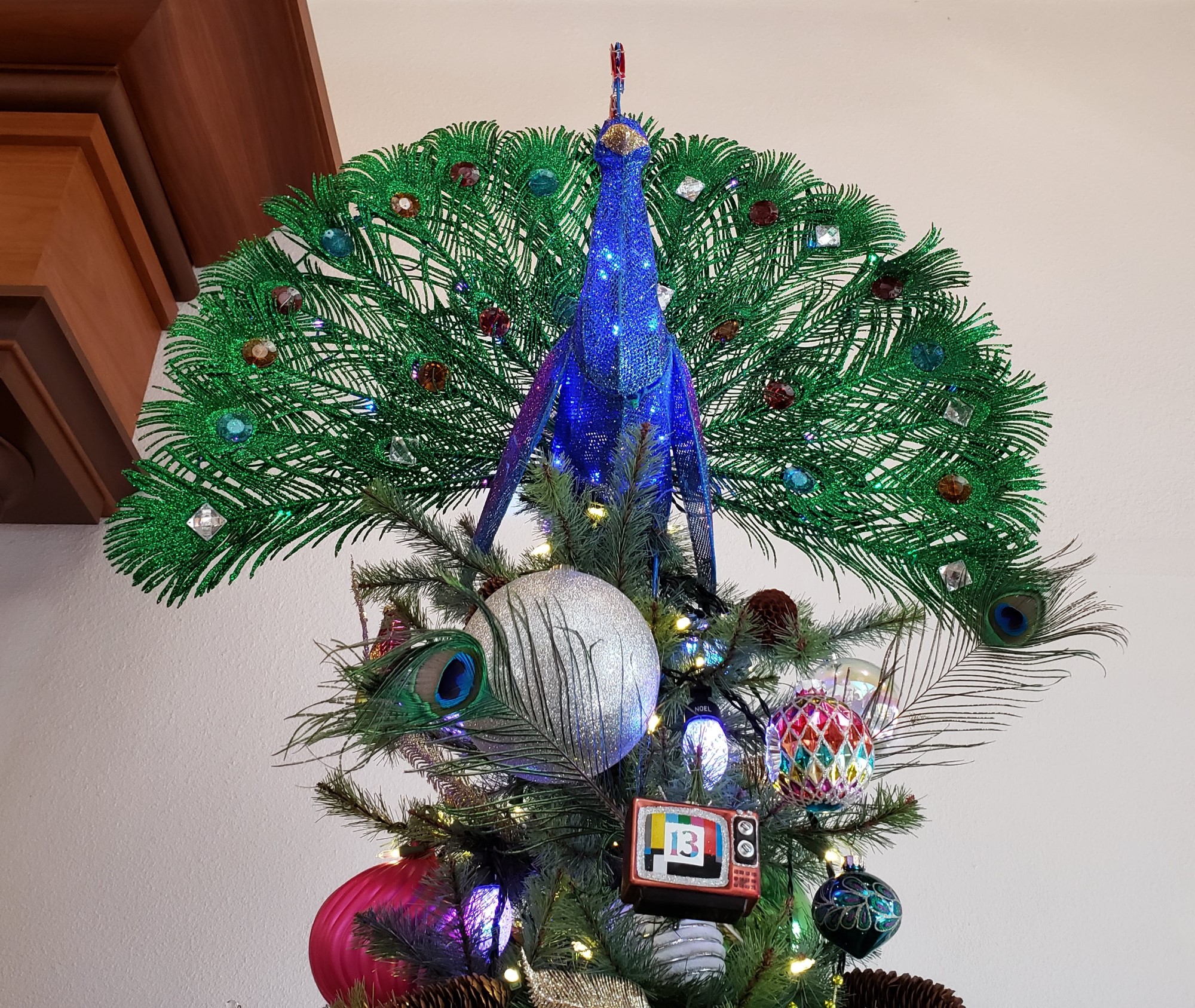 Christmas treetop with peacock, ornaments and tiny TV with Channel 13 test pattern