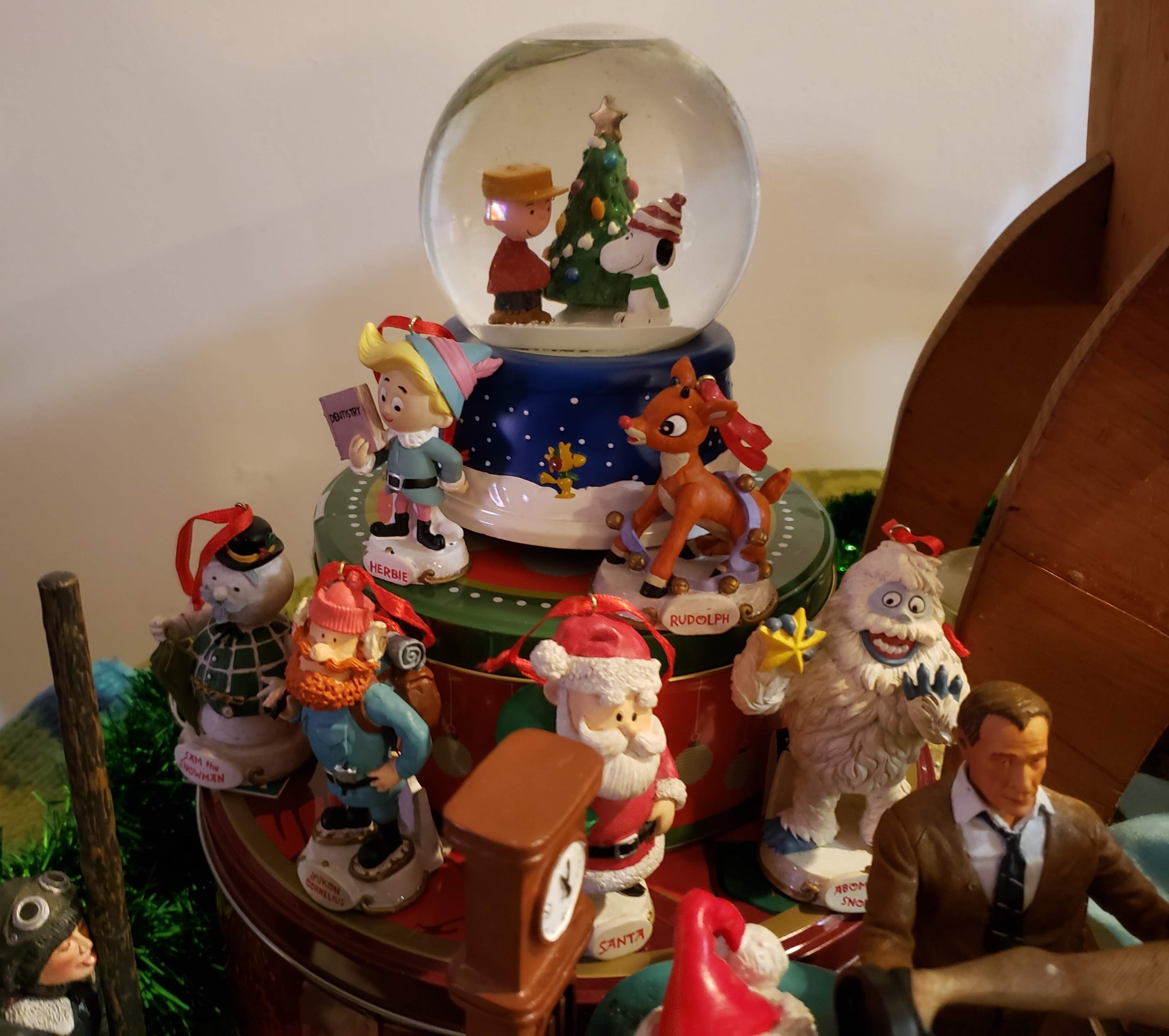 A small and a large Christmas cookie tin stacked in a tiny ziggurat on a festive table. On top is a Peanuts snow globe. On each level stand ornaments of the cast from Rankin-Bass' "Rudolph the Red-Nosed Reindeer".