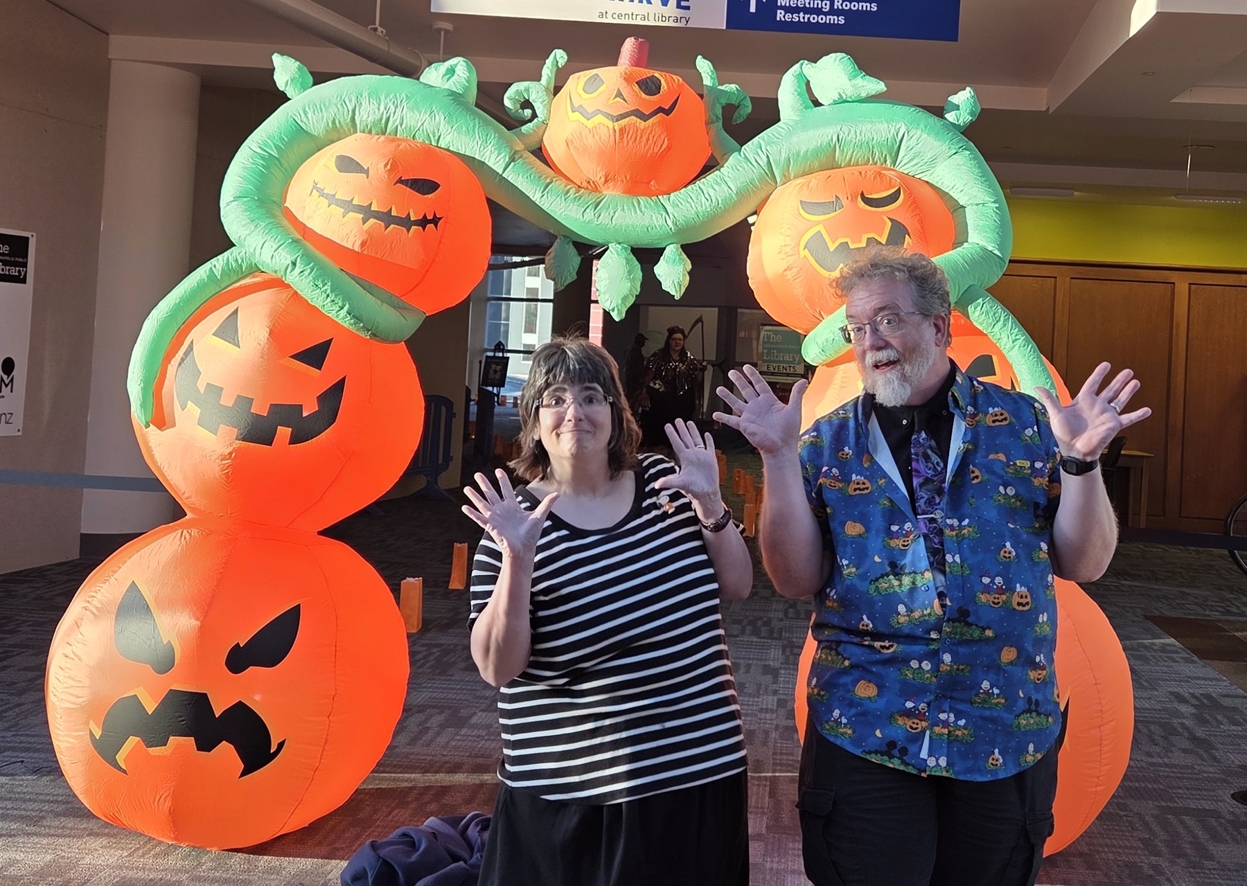 Anne and me doing jazz hands in front of an arch made of inflatable jack-o'-lanterns.