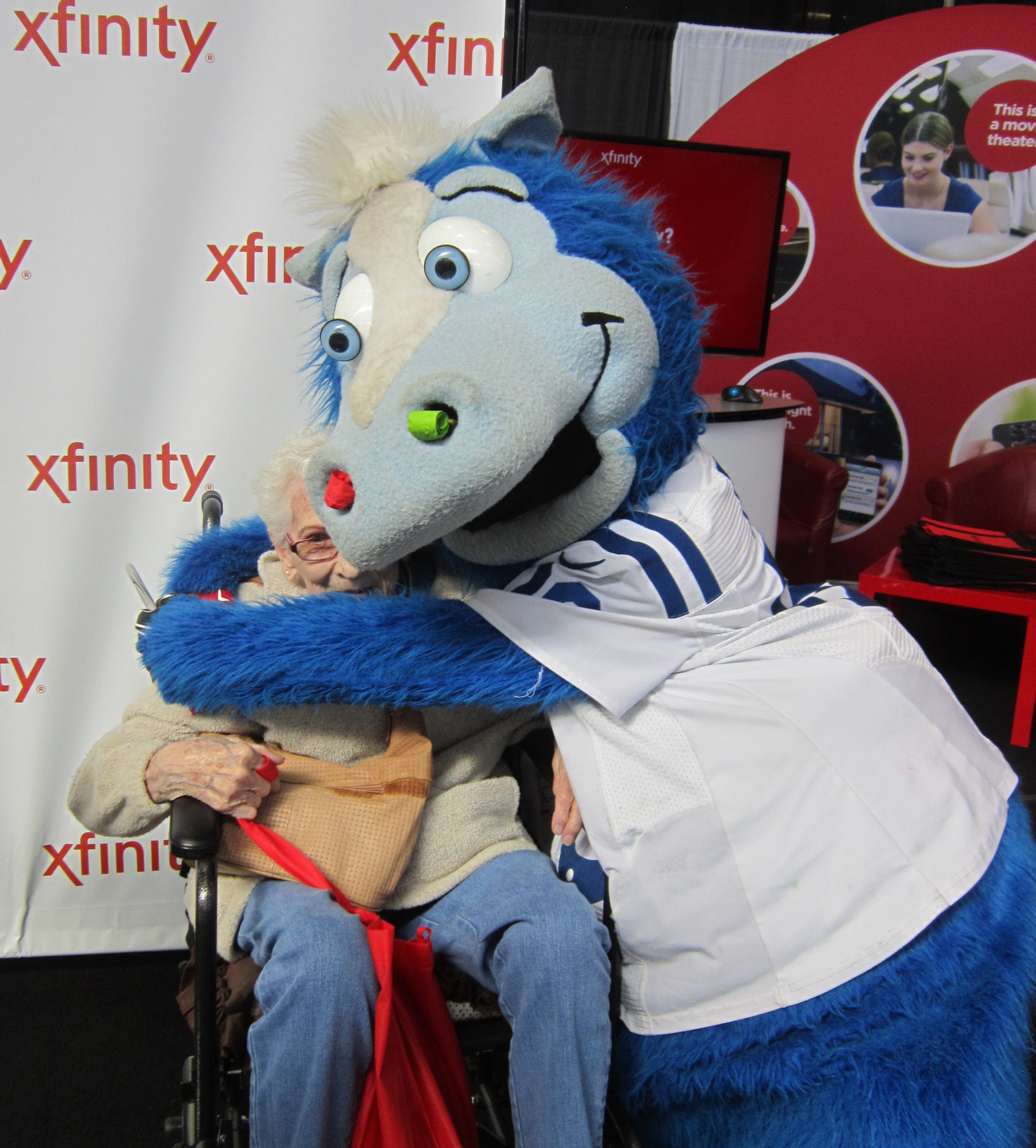 Meanwhile, their comparatively classy competitors over at Comcast/Xfinity bought one (1) booth and, instead of practicing gotcha salesmanship, invited a celebrity spokesperson to hang out with them and sign autographs: Blue, the official mascot for the Indianapolis Colts!