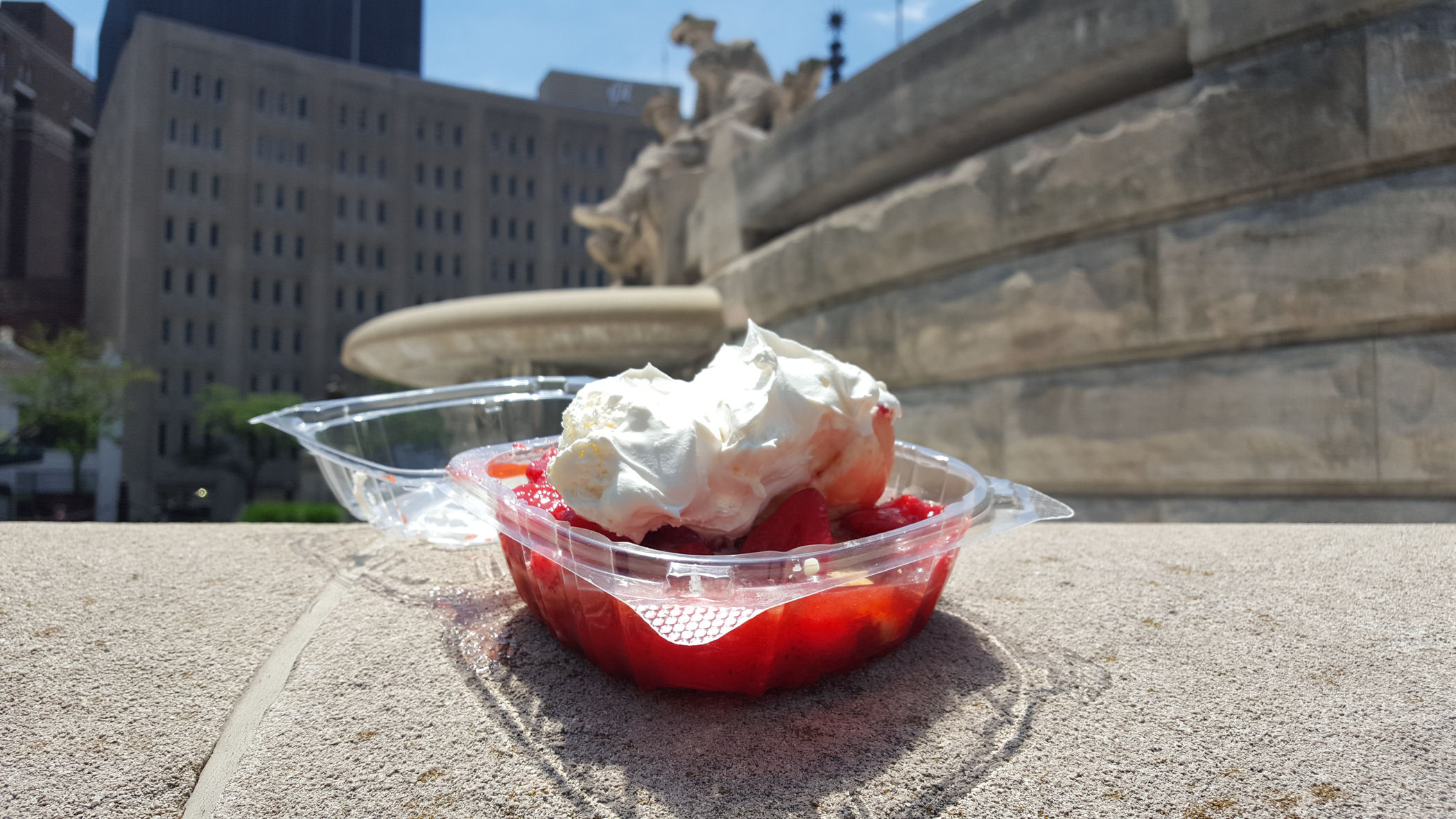 Monument Circle, the center of Indianapolis. Don’t asl me why someone built a little house on one of those rooftops.