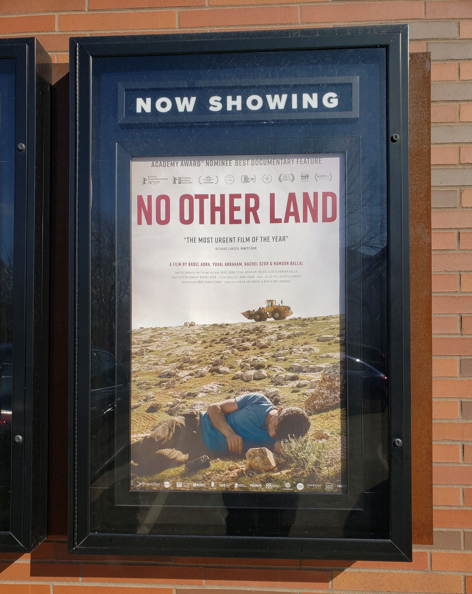 Movie poster in a black case hanging on an exterior brick wall. Poster image is a young Palestinian man fallen on a rocky plain and a bulldozer parked on the distant horizon.