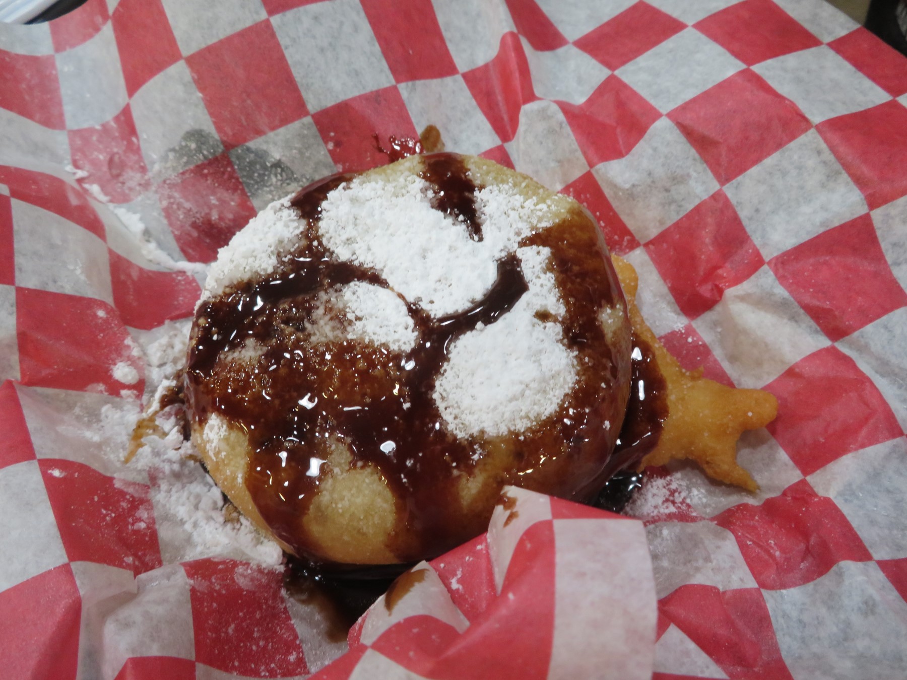 In all we tried eight Taste of the Fair items during our 7½-hour stay and walked off several of those cumulative calories around the fairgrounds and inside the exhibit halls, whose contents we’ll cover in subsequent chapters. I wish we could’ve tried more, but: (a) food in general was pricier than ever, apropos of the economy today; (b) Taste of the Fair items in particular seemed much more expensive, possibly under the assumption that all fair-food fans are wealthy influencers or are just plain irresponsible with their credit cards; (c) the older we get, the less we should be eating, and the less we can eat; and (d) some vendors now approach Taste of the Fair as a chance to create their own Man V. Food super-sized eating challenges suitable only for the mightiest wrestling champions, compiling sandwiches so large that, were I to try one, I wouldn’t be able to eat again for days. And this chapter would look pretty silly with only a single sandwich pic.