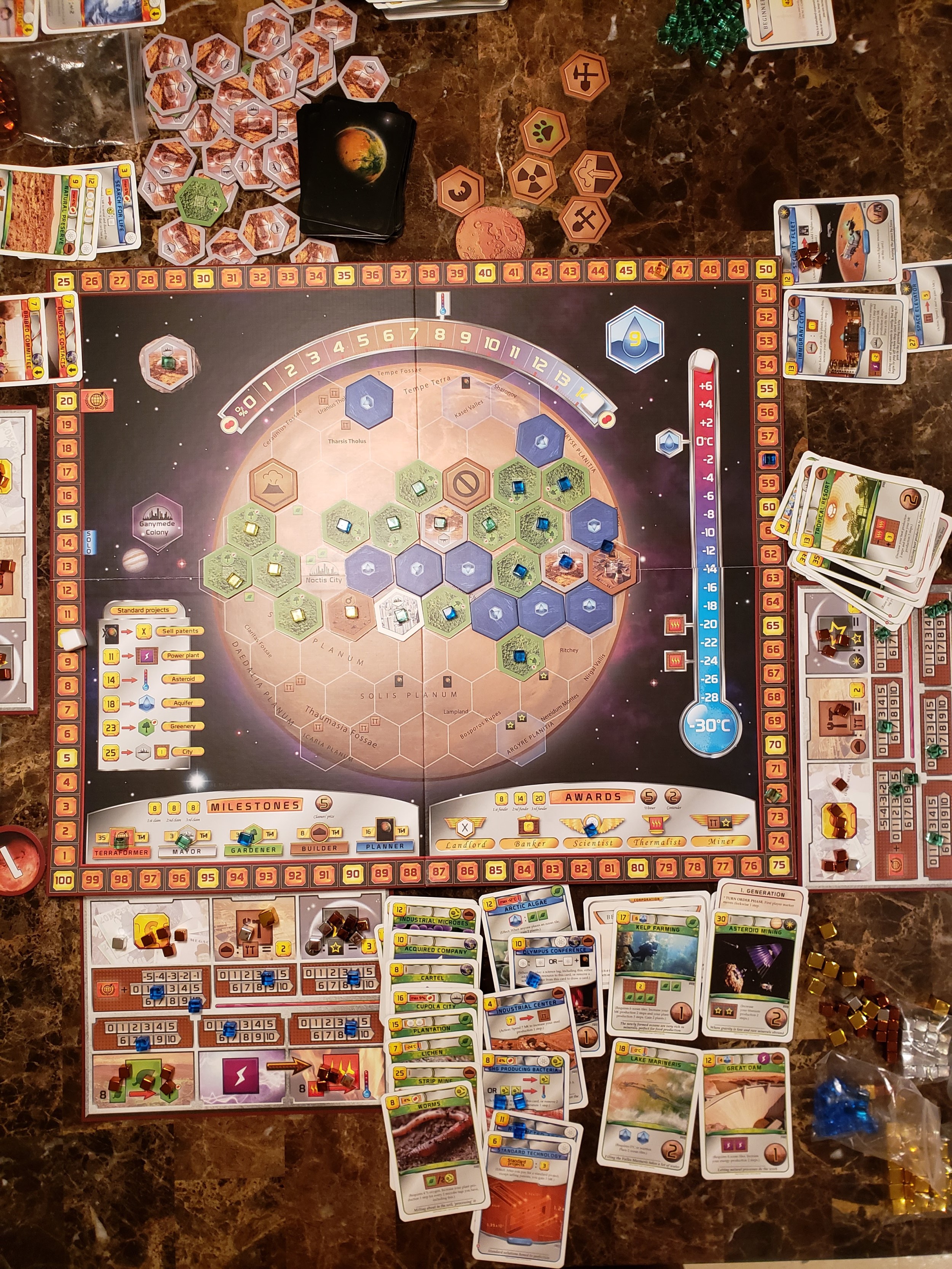 * Family Game Night! That was Saturday evening. I’ve posted in the past about some of our experiences with new board games. The ones that catch our attention are too expensive for us to make this a regular habit, although after seeing how many Likes my Instagram posts get whenever I share them, it’s really tempting to reinvent myself as a Board Game Guy. Our latest acquisition is Terraforming Mars, a 2016 release in which each player is a future corporation doing its part to turn Mars into Earth Junior, ostensibly in the name of solving a humanitarian crisis and advancing humankind’s frontiers and scientific achievements, but also you’re competing to see who can take the most credit. Corporations gonna corporate.